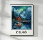 Een sublieme illustratie van een chalet verlicht door het noorderlicht, omringd door besneeuwde bergen en rustig water. Perfect om een warme, mysterieuze sfeer in je huis te creëren.