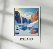 Laat je meevoeren door de ijzige schoonheid van IJsland met deze illustratie van een majestueuze waterval omringd door steile kliffen en smetteloze sneeuw. Een opvallend Scandinavisch landschap dat de puurheid en grootsheid van de natuur oproept, ideaal voor een inspirerende en rustgevende decoratie.