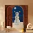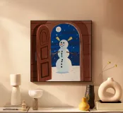 Een besneeuwd uitzicht nodigt een hond en kat uit voor een deur waar een sneeuwpop staat te wachten. De ijzige sfeer en speelse uitnodiging belichamen de charme van winterse magie.