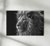 Dit indrukwekkende zwart-wit portret van een majestueuze leeuw toont de indrukwekkende manen en krachtige snuit in een gedetailleerde close-up. De minimalistische compositie en de fijne vachttextuur benadrukken de natuurlijke schoonheid en kracht van dit wilde dier.