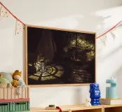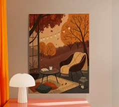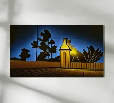Zachte, minimale verlichting van een gestreepte lamp werpt gedessineerde schaduwen over een donker terras. Twee stoelen doemen rustig op in de achtergrond en creëren een mysterieuze, intieme sfeer 's nachts. Dit kunstwerk is geschikt voor ruimtes als slaapkamers, leeshoekjes, gezellige lounges, moderne woonkamers of elke andere plek waar subtiel licht en een contemplatieve sfeer op prijs worden gesteld.