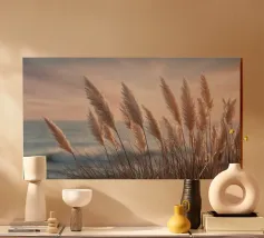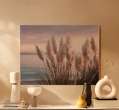 The pampas grass on the shore rises like a delicate dream; filigree, light, almost weightless. The sky shimmers in soft shades of pink, apricot and lavender over the still water. The air seems to be full of poetry, as if every stalk is telling a little story about the peace of the evening. No sound disturbs the harmony. The composition exudes pure gentleness, a pause in the moment. Ideal as a meditative nature shot for rooms that should radiate peace, space and elegance. This picture gives everyday life a gentle escape into the dreamlike.
