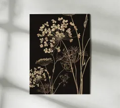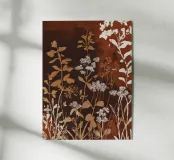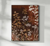 "Rust Meadow" gloeit met de warmte van het herfstlicht, waar sienna, oker en zacht ivoorkleurige plantensoorten oprijzen uit diepe aardetinten. De gelaagde penseelvoering roept de stille poëzie op van velden in de schemering, waarbij organische details samensmelten met moderne abstractie. Een studie naar diepte, warmte en natuurlijke gratie.