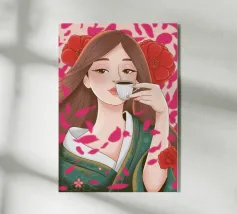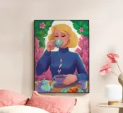 Een portret van een chique blonde vrouw in een blauwe coltrui, genietend van een kopje thee. Haar serene uitdrukking en de gezellige sfeer creëren een moment van elegante en vredige rust.