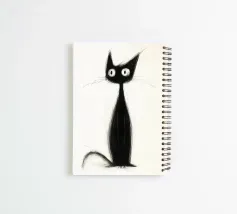 Een minimalistische zwart-wit illustratie van een slanke, zwarte kat met overdreven wijde ogen en schetsmatige trekken. Het grillige en abstracte ontwerp van de kat voegt een speels, artistiek tintje toe.