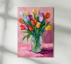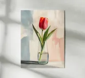 Illustration douce et élégante d’une tulipe rouge et orange délicatement placée dans un verre d’eau. Les nuances pastel du fond ajoutent une touche poétique et raffinée. Une affiche murale idéale pour une décoration florale apaisante et minimaliste.
