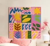 Een speels en energiek patroon van geometrische en organische vormen, gerangschikt in een kleurrijk patchwork- of quiltachtig ontwerp. Het kunstwerk is een vrolijke en levendige viering van kleur en vorm.