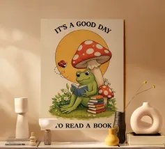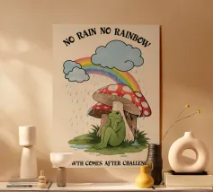 Een levendige en grillige scène met een felroze kikker bovenop een rode paddenstoel met witte vlekken, omringd door weelderig gebladerte en gloeiende bloemen in een mistig, betoverend bos. De magische sfeer versterkt de surrealistische schoonheid.