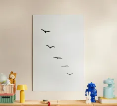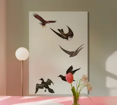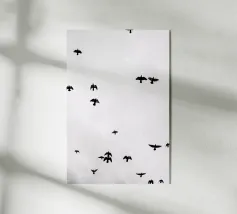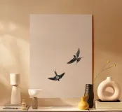 Dit minimalistische ontwerp toont twee zwaluwen die sierlijk door de lucht glijden. De zwart-witte illustratie en de eenvoudige, heldere achtergrond geven het motief een tijdloze en elegante uitstraling. Dit ontwerp is perfect voor liefhebbers van natuurmotieven en minimalistische kunst en brengt rust en lichtheid in elke kamer. Of het nu als muurschildering, kussen of mok is, dit motief is een stijlvol en modern accent voor elk huis en past bij verschillende interieurstijlen.
