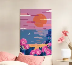 Een serene landschapsillustratie van meeuwen die over een kalme zee vliegen naar een ondergaande zon, met bergen op de achtergrond, alles in een zacht, warm kleurenpalet.