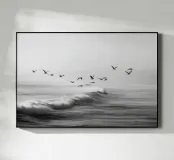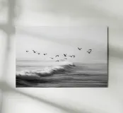 Een opvallende zwart-witfoto van een zwerm meeuwen die sierlijk zweeft boven krachtige oceaangolven. De contrastrijke tinten creëren een dramatische maar serene kustscène, perfect voor een elegante en minimalistische inrichting.