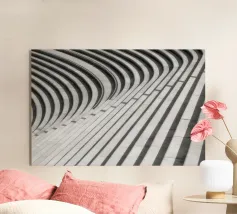 Zwart-wit poster van minimalistische architectuur: zigzaggende buitentrap, bevestigd aan een lichte gevel en gesneden door laaghangend licht dat lange grafische schaduwen werpt. Strakke lijnen, beton met textuur en een repeterend ritme creëren een hypnotiserend geometrisch beeld. Een elegante wandposter voor de woonkamer, het kantoor of de gang, die reliëf, moderniteit en evenwicht brengt in hedendaagse, Scandinavische, industriële of Japanse decors.
