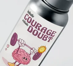 A brain is depicted being filled with coffee from a pot, accompanied by a loading bar below. The illustration humorously suggests the mind's need for coffee to function properly.