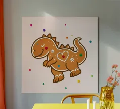 Deze lieve kleine dinosaurus is helemaal gericht op het verspreiden van liefde, want hij houdt vrolijk een felroze hart vast terwijl hij zweeft op een bed van kleurrijke wolken. Met zijn grote, stralende ogen en speelse uitdrukking brengt deze dino een onweerstaanbare charme in elke omgeving. De levendige oranje, groene en roze tinten maken het een heerlijke visuele traktatie voor dino-liefhebbers van alle leeftijden. Of het nu een leuke toevoeging is aan je inrichting of een leuk cadeau, deze schattige dinosaurus is klaar om een glimlach en warmte te delen!