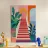 Levendige rode trappen leiden omhoog door een kleurrijk, vereenvoudigd gebouw naar een weelderige, gewelfde ingang, die een reis naar een mooie en exotische bestemming suggereert.