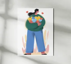 Dit kunstwerk toont een persoon met kort blond haar die een gebloemde jas draagt en een boek vasthoudt. De felgele achtergrond versterkt de chique en stijlvolle uitstraling.