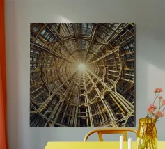 Deze afbeelding toont ingewikkelde cirkelvormige architectuur met sierlijke stenen zuilen, een centraal standbeeld en een glazen plafond. Het surrealistische perspectief creëert een tunnelachtig effect, waardoor het oog naar het midden van de compositie wordt getrokken.
