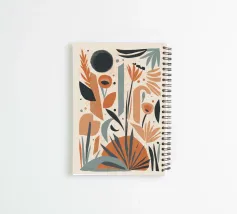 Een moderne abstracte compositie van verschillende gestileerde botanische vormen en bladeren in een palet van terracotta, beige en donkerblauw tegen een lichte achtergrond.