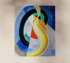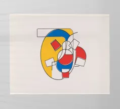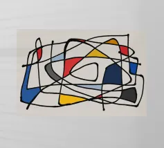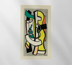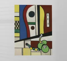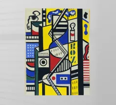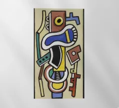 Dit zeer abstracte wandtapijt van Fernand Léger toont zijn karakteristieke gebruik van sterke zwarte contouren en gedurfde primaire en secundaire kleuren. De compositie wordt gekenmerkt door dikke, kronkelende vormen die doen denken aan een diskantlijn of muzieknotatie, afgezet tegen blokken kleur en witte baksteenachtige patronen. Het werk weerspiegelt Légers levenslange verkenning van pure vorm en kleur.