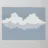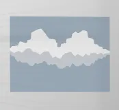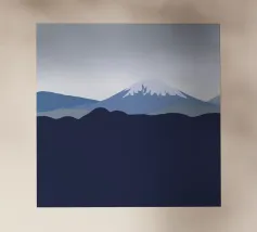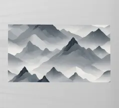 Een minimalistische voorstelling toont abstracte bergtoppen met spiegelende reflecties tegen een zachtblauwe achtergrond. De simplistische stijl benadrukt de gekartelde randen en serene sfeer.