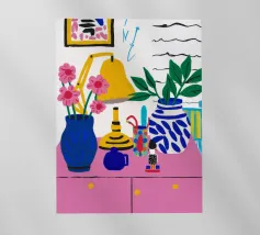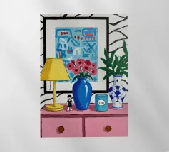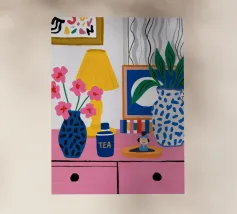 A quirky desk with pink lamp, vase flowers, matryoshka, and tea brings playful personality.