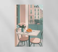 An illustration of a dining table with chairs, with strong, long shadows cast from a nearby window. The composition is a moody, atmospheric, and artistic study of light and domestic space.