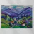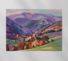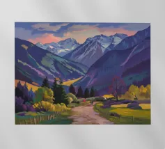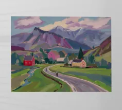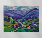 Een kleurrijk landschapsschilderij toont een dorp genesteld op een heuvel met levendige, patchwork-achtige velden in groene, blauwe en paarse tinten, met roodgedekte huizen onder een heldere hemel.