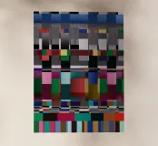 An abstract composition features a series of geometric shapes and bold, vibrant colors arranged in a grid pattern. Distinctive blocks of color are interspersed with linear elements, creating a visually dynamic and modern design.