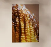 Een rauwe maïskolf verticaal gevangen, waarbij de netjes gelijnde pitten en de vloeiende bruine zijde zichtbaar zijn. De natuurlijke texturen en subtiele kleuren creëren een abstracte maar speelse compositie, waardoor het een eigenzinnige en charmante toevoeging is aan keukens, eethoeken of moderne eclectische ruimtes.