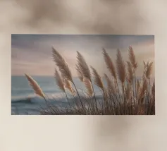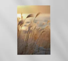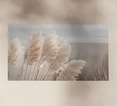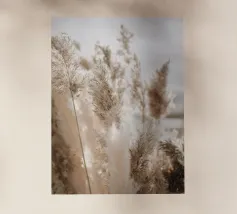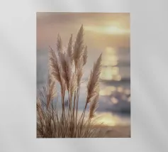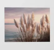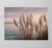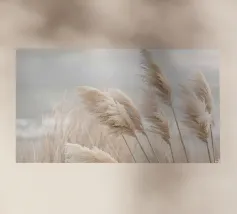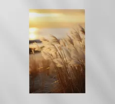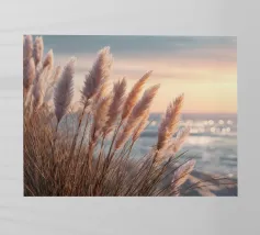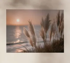 Het pampagras aan de oever rijst op als een delicate droom; filigraan, licht, bijna gewichtloos. De lucht glinstert in zachte tinten roze, abrikoos en lavendel over het stille water. De lucht lijkt vol poëzie, alsof elke stengel een klein verhaal vertelt over de vrede van de avond. Geen enkel geluid verstoort de harmonie. De compositie straalt pure zachtheid uit, een pauze in het moment. Ideaal als meditatieve natuurfoto voor kamers die rust, ruimte en elegantie moeten uitstralen. Deze foto geeft het alledaagse leven een zachte ontsnapping naar het dromerige.