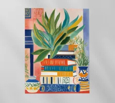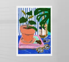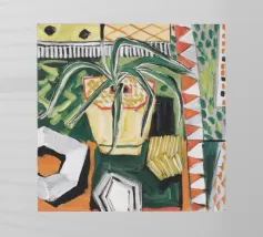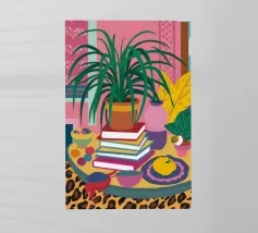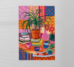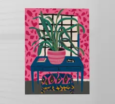 Een stilleven van een potplant en andere objecten op een tafel met een kleurrijk, gedessineerd tapijt eronder. De compositie tegen een roze muur is modern, eclectisch en zit vol charmante, decoratieve details.