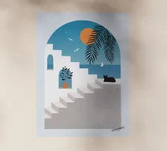 Een charmante illustratie van een zwarte kat die op de trappen van een mooie stad aan zee zit, met gebouwen in zachtroze. Het tafereel is vredig, schilderachtig en vol mediterrane charme.