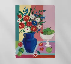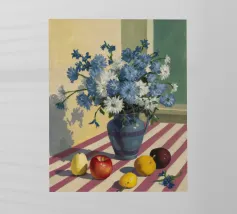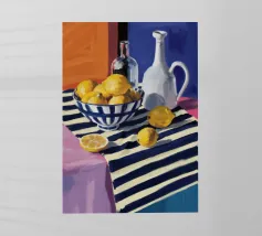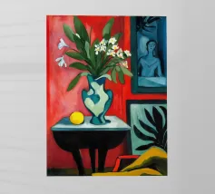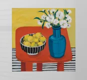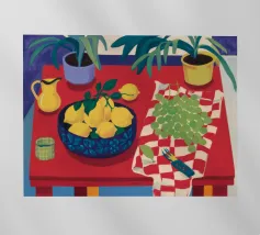 An inviting still life on a bright red table, featuring a bowl of lemons and a blue vase holding delicate white flowers. The warm yellow background enhances the cozy and vibrant atmosphere.