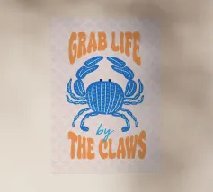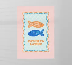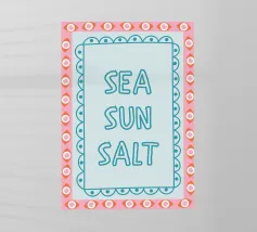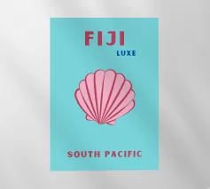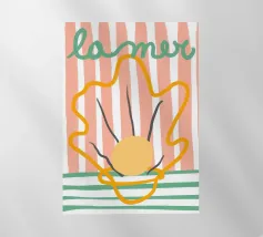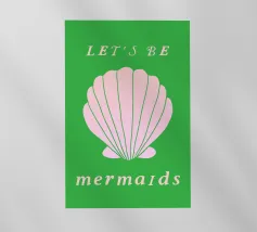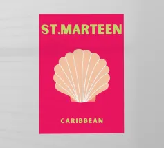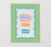 Roze schelp met decoratief kader op groene achtergrond met de tekst Shell yeah! Voor alle strandliefhebbers!