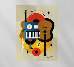 Een modern abstract schilderij met geometrische vormen die gitaren, violen en muzieknoten vormen in een gedurfde, kleurrijke compositie. De achtergrond met textuur en het dynamische arrangement roepen een gevoel van ritme en artistieke expressie op.