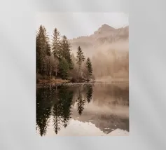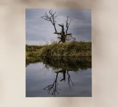Het water beneden weerspiegelt de boom perfect en vangt elk blad en elke kromming in een zachte, glinsterende weerspiegeling. Het oppervlak is kalm, als glas, en vervaagt de grens tussen de werkelijkheid en zijn gespiegelde tweelingbroer. Terwijl het licht zachtjes over het tafereel beweegt, lijkt de weerspiegeling mee te bewegen - een stille dans van natuur en water, schoonheid en balans.