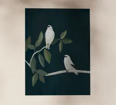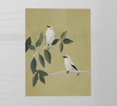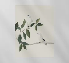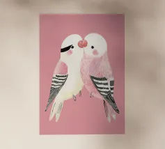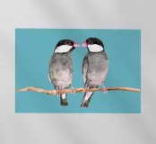 A watercolor drawing of two Java sparrows. They sit next to each other on a long stick and touch each other with the tips of their beaks.
