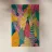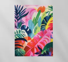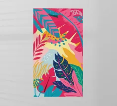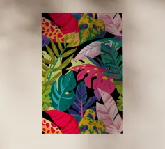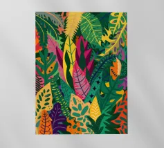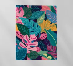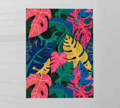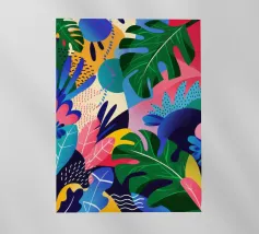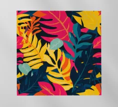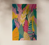 A dense, colorful pattern of overlapping tropical leaves and abstract shapes in bright hues of yellow, pink, blue, and green, creating a joyful, energetic design.
