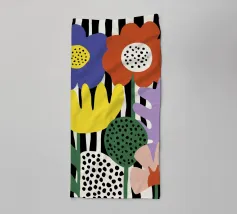 Een levendige, abstracte tuinscène weergegeven als een lappendeken van gestippelde en gedessineerde bloemen tegen een donkere achtergrond. Het kunstwerk is een vrolijke en fantasierijke interpretatie van een bloeiende tuin.