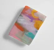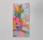Het motief toont een levendige, abstracte bloemencompositie vol energie en beweging. Dynamische penseelstreken in roze, oranje en groen smelten samen met zachte pastelkleuren om moderne, bloemige kunst te creëren. Het schilderij geeft het werk diepte en zomerse lichtheid.