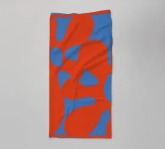 Abstracte vormen met gedurfde, vloeiende rode en blauwe vormen creëren een levendige, dynamische compositie. De toevoeging van gele lijnen voegt contrast en beweging toe aan het ontwerp.