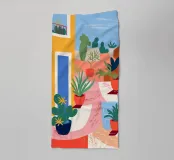 Kleurrijke potplanten staan langs een kronkelend pad tegen een levendige, abstracte achtergrond van geometrische vormen. De compositie heeft verschillende tinten groen, blauw, roze en geel, waardoor een levendige, vrolijke sfeer ontstaat.