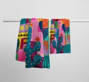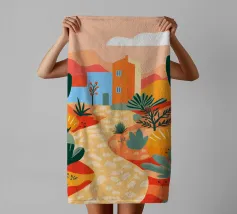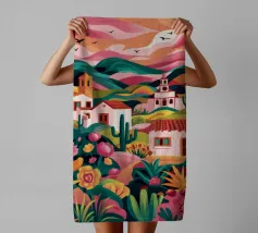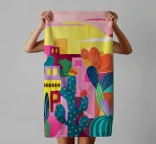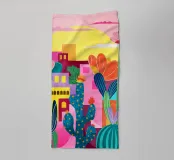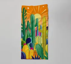 Een levendig woestijnlandschap met bloeiende cactussen, kleurrijke geometrische gebouwen en een stralende zonsondergang. Het gedurfde kleurenpalet mengt warm roze, geel en diep blauw en creëert een levendige zuidwesterse sfeer. Perfect om een vleugje warmte en artistieke charme toe te voegen aan elke ruimte!