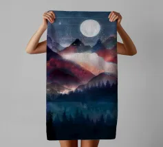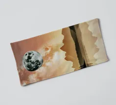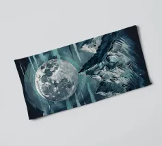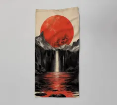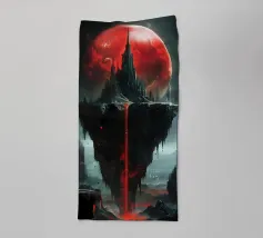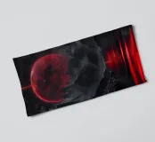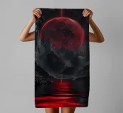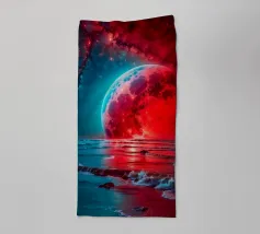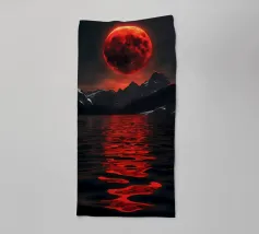 A breathtaking scene of a crimson moon casting its eerie glow over a desolate, mountainous landscape. The reflection of the celestial body in the still waters creates a mesmerizing contrast between light and shadow. This artwork evokes a sense of mystery and awe, inviting the viewer to contemplate the vastness and beauty of the universe.