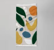 Dit abstracte kunstwerk deconstrueert vruchten zoals peren en sinaasappels tot hun organische basisvormen en kleuren. De overlappende vormen in een palet van oker, blauw en groen creëren een moderne en verfijnde compositie die een subtiele knipoog is naar een klassiek stilleven.