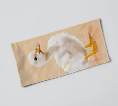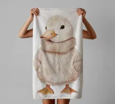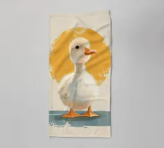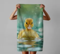 Een schattig eendje komt tevoorschijn vanonder een zachte witte handdoek. Zijn pluizige gele veren en nieuwsgierige ogen creëren een schattig en charmant tafereel.
