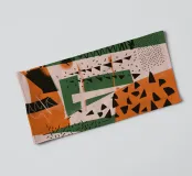Een dynamische collage van botsende patronen en texturen, waaronder stippen, strepen en abstracte krabbels. De compositie in beige, zwart en rood is een gedurfd en eclectisch statement dat de creatieve chaos viert.
