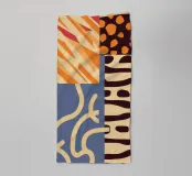 Een abstract kunstwerk samengesteld uit verschillende gestructureerde patches, waaronder dierenprints en effen kleuren zoals oranje en blauw, waardoor een visueel interessant en harmonieus modern patchwork ontstaat.