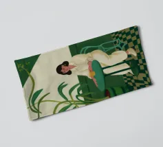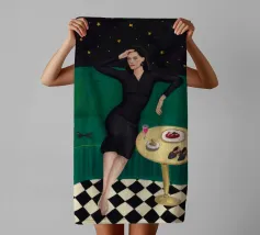 Een vrouw in een elegante zwarte jurk ontspant op een groene bank op een dambordvloer, met een nachtelijke sterrenhemel achter haar, waardoor een surrealistische en chique hemelse scène ontstaat.