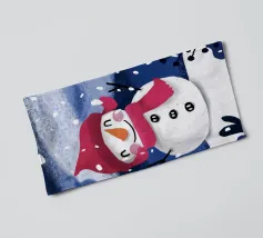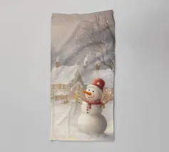 Een besneeuwd uitzicht nodigt een hond en kat uit voor een deur waar een sneeuwpop staat te wachten. De ijzige sfeer en speelse uitnodiging belichamen de charme van winterse magie.